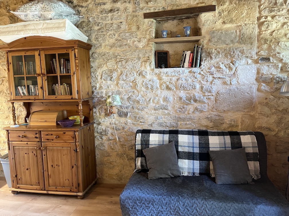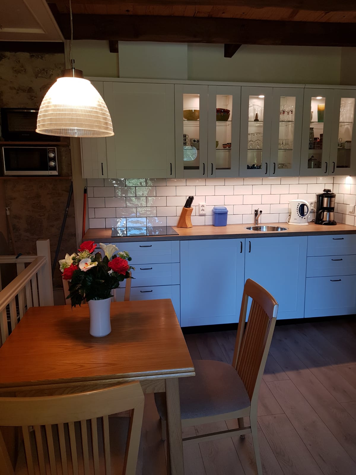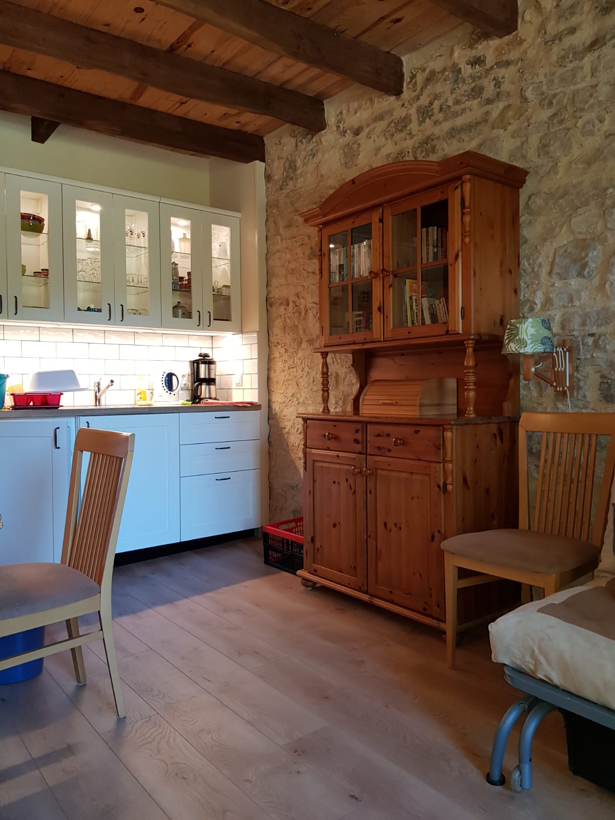 Via de trap kom je op de sfeervolle eerste verdieping waar een studio is met keuken, eethoek, zithoek en een tweepersoonsslaapbank. De keuken is uitgerust met een elektrische kookplaat, combimagnetron, elektrische oven, koffiezetapparaat, waterkoker en al het benodigde keukengerei, bestek en servies. Ook beddengoed en handdoeken zijn aanwezig of worden aangeleverd.