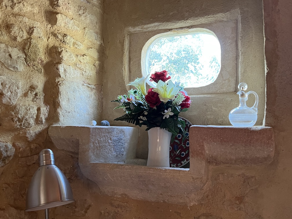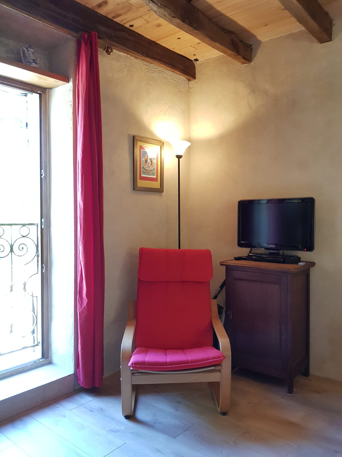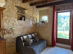 Mocht het een beetje kil zijn, dan kun je de elektrische kachel aanzetten. Verblijf je hier in de zomer, dan is het huis behaaglijk koel, aangezien het aan de noordkant van Villefranche ligt. Vanaf het Frans balkon heb je een nog beter uitzicht over het dal. Hoewel bij de renovatie veel is vernieuwd, zijn er nog tal van oorspronkelijke details te zien. Een daarvan is het raampje links, dat in vroeger tijden dienst deed als gootsteen. De oude bewoners van Villefranche gooiden hun afwaswater zo de straat op!